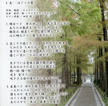 「このメロディーなら、歌用、普段用に編曲して、そこに素晴らしい歌詞がつけば、きっと皆様の役に立たせて頂ける曲になるのでは」、と思い、早速、いつも「魂の洗われるような素晴らしいオリジナル詩」を書いてらっしゃる音楽仲間で朗読家の「ひふみようこ」様にお願いしたところ、被災地支援を 念頭に「光・・・はぐくみ愛」という素晴らしい歌詞をつけて下さいました。